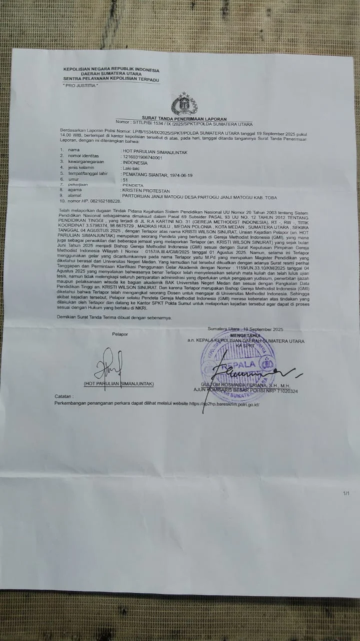 ( Medan Sumut ) – Info86News.com – Juma”at 24 Oktober 2025 -Dugaan telah melakukan tindak pidana kejahatan sistem pendidikan nasional sesuai dengan undang-undang nomor 20 Tahun 2003 tentang sistem pendidikan nasional sebagaimana dimaksud dalam pasal 69 subsider pasal 93 undang-undang nomor 12 Tahun 2012 tentang pendidikan tinggi seorang Bishop gereja Methodist Indonesia (GMI) berinisial KWS dilaporkan ke sentra pelayanan kepolisian terpadu (SPKT) Polda Sumatera Utara, pada (10/09/2025) lalu.