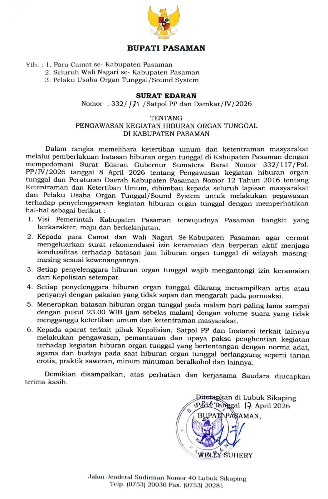 Kebijakan yang mulai berlaku April 2026 ini merupakan tindak lanjut dari Instruksi Gubernur Sumatera Barat dan Peraturan Daerah Nomor 12 Tahun 2016 tentang Ketentraman dan Ketertiban Umum. Surat Edaran bernomor 332/131/Satpol PP dan Damkar/IV/2026 ini ditujukan langsung kepada seluruh Camat, Wali Nagari, hingga pelaku usaha sound system dan hiburan di seluruh wilayah Pasaman.
