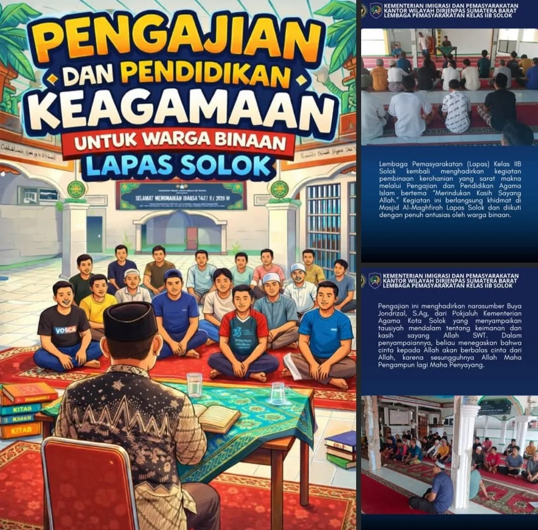 Solok-info86news.com-Lembaga Pemasyarakatan (Lapas) Kelas IIB Solok kembali menghadirkan kegiatan pembinaan kerohanian yang sarat makna melalui Pengajian dan Pendidikan Agama Islam bertema “Merindukan Kasih Sayang Allah.” Kegiatan ini berlangsung khidmat di Masjid Al-Maghfirah Lapas Solok dan diikuti dengan penuh antusias oleh warga binaan. Kamis(09/04)