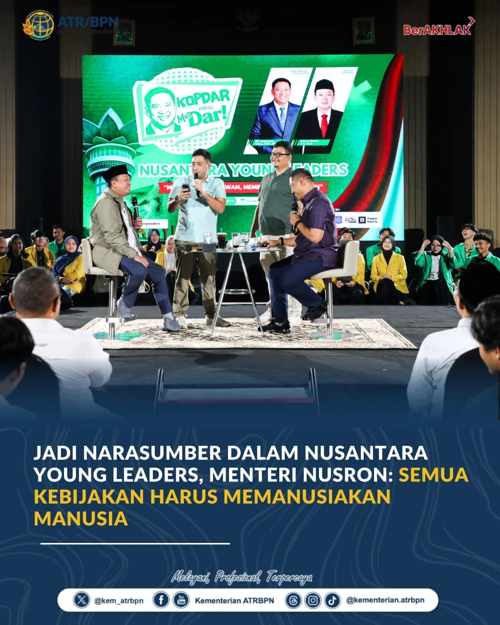 “Karena kita (mantan) aktivis mahasiswa, cara menyelesaikan masalah itu dengan cara pendekatan yang kemanusiaan dan berkeadilan. Manusia itu kita tempatkan yang utama. Semua kebijakan ini harus memanusiakan manusia,” ujar Nusron.