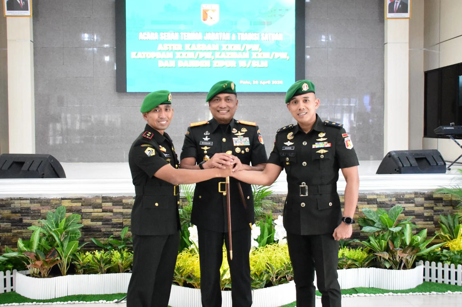 ( Palu ) – Info86News.com – Minggu.26/04/2026/-Panglima Komando Daerah Militer (Pangdam) XXIII/Palaka Wira, Mayor Jenderal TNI J. Binsar P. Sianipar, memimpin upacara serah terima jabatan (Sertijab) dan tradisi satuan bagi empat pejabat Kodam XXIII/Palaka Wira. Kegiatan berlangsung di Aula Gedung Manggala Sakti Makodam XXIII/Palaka Wira, Palu, Sabtu (25/4/2026).