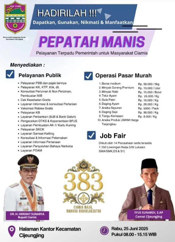 Ciamis, Info86news.com Kegiatangitan Pelayanan Terpadu Pemerintah untuk Masyarakat Ciamis(Pepatah Manis)yang disinergikan dengan Operasi Pasar Murah(OPM) dan Job Fair, dilaksanakan dihalaman Kantor Kecamatan Cijeungjing,dalam rangka Pemerintah Kabupaten Ciamis,memperingati hari jadi yang ke-383.”25/6/2025