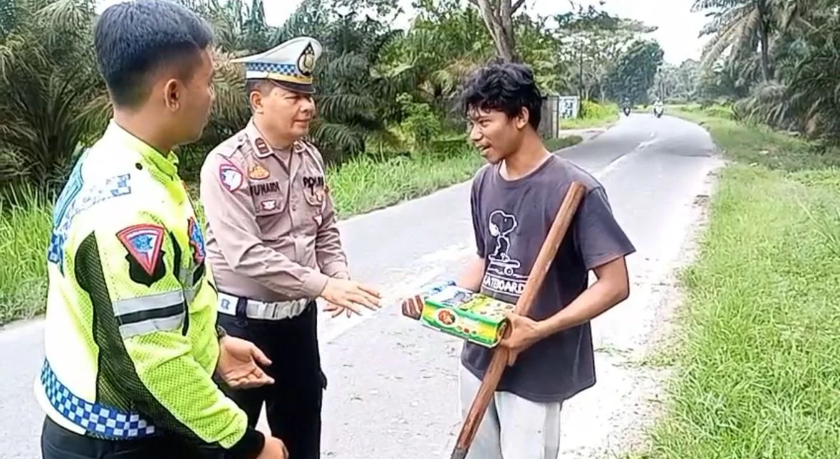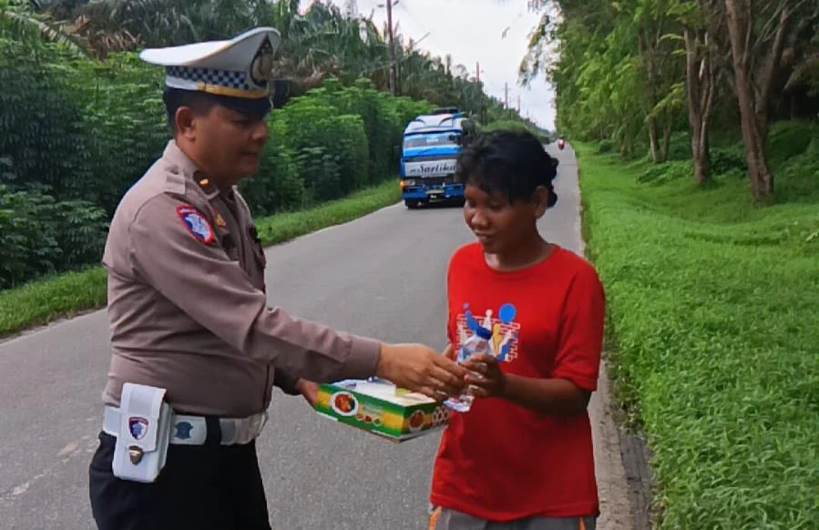 B. Petugas Satlantas Yang Melaksanakan Ke Giatan Berbagi Nasi Kotak Kepada Masarakat Yang Di Temukan Di Jalan Simpang Dolok