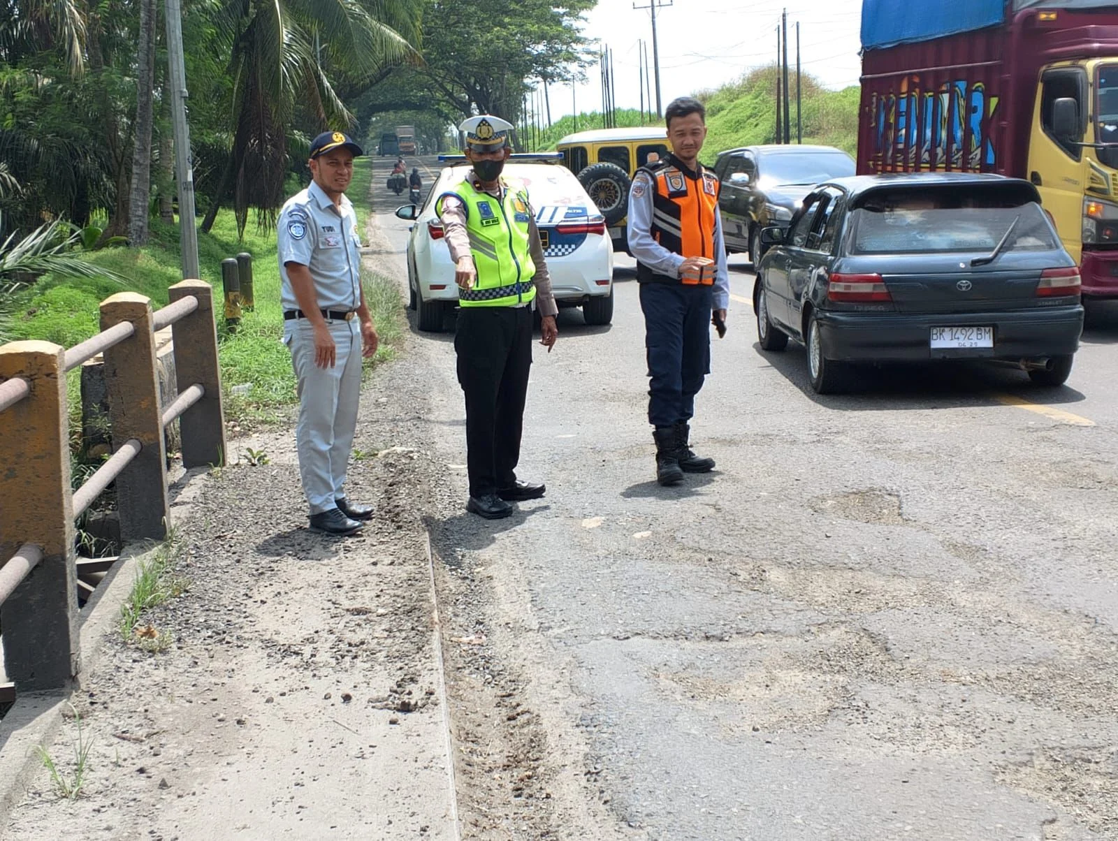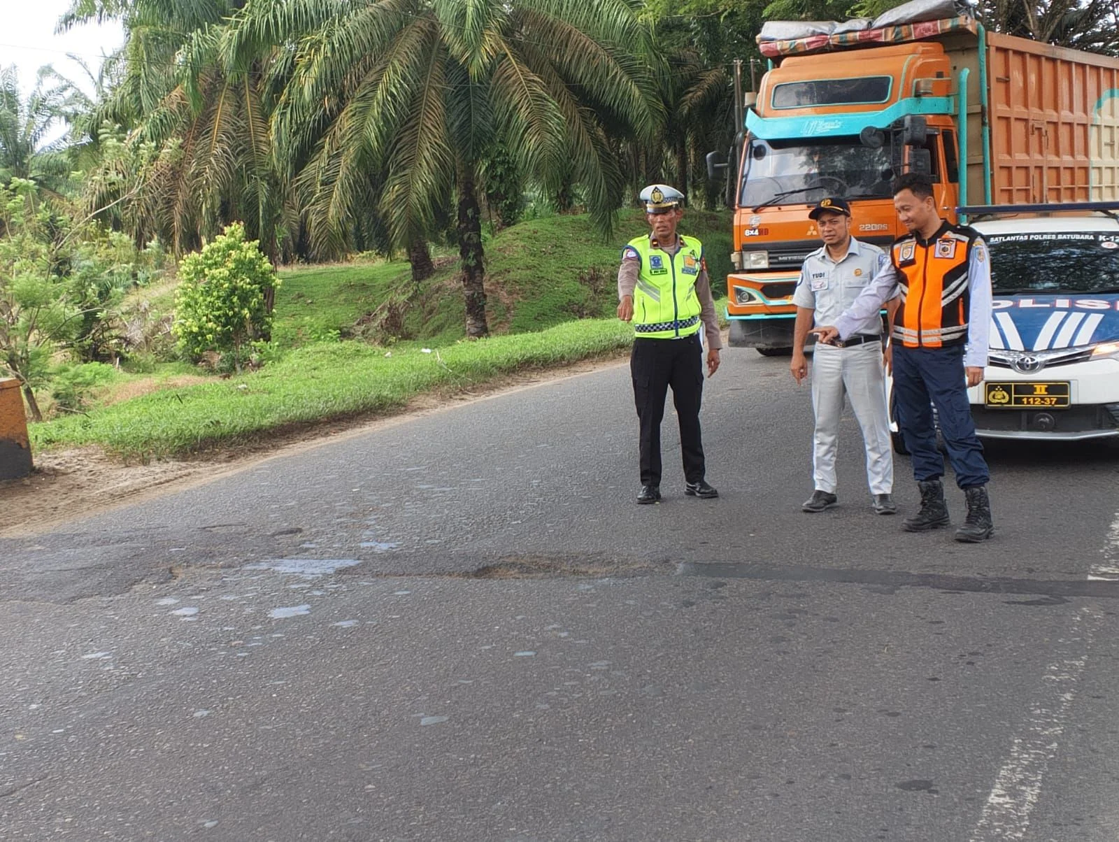 Personil Satlantas Polres Batu Bara Melakukan Mapping Jalan Rusak Berlubang Daerah Jalan Lintas Lima Puluh Sei Bejangkar Bersama Dinas Perubungan Kabupaten Batu Bara Dan PT Jasaraharja