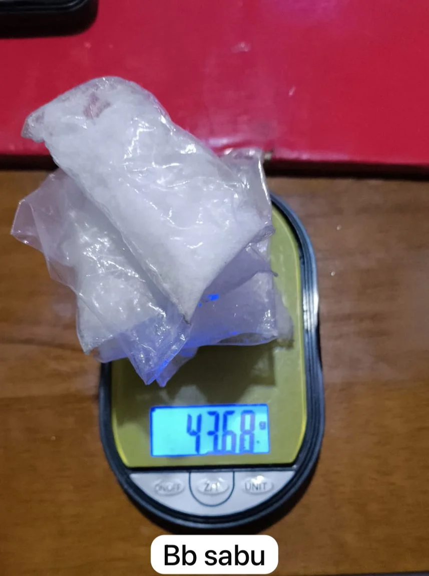 Tanpa menunggu lama, petugas langsung melakukan penangkapan dan penggeledahan. Dari hasil pemeriksaan, ditemukan empat bungkus plastik transparan berisi narkotika jenis sabu dengan berat bruto 43,68 gram yang disimpan di dalam tas pelaku.