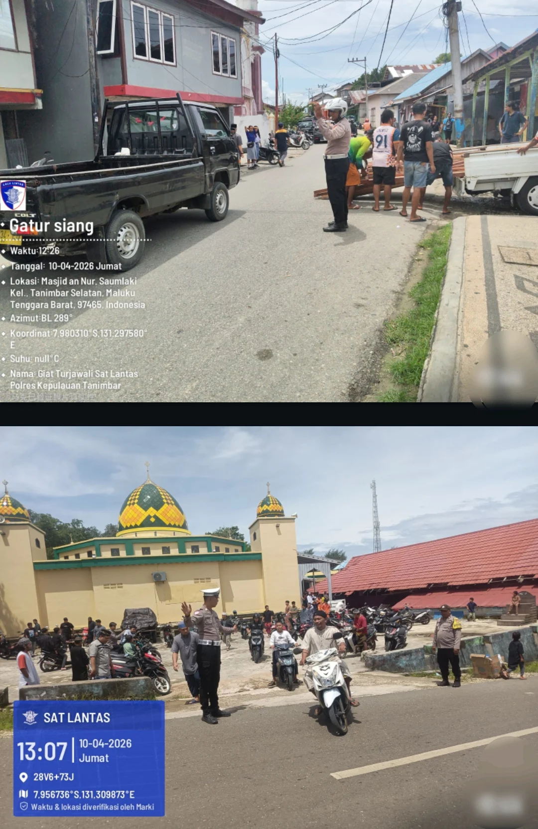 http://info86news.com | Saumlaki, 10 April 2026 – Satuan Lalu Lintas (Sat Lantas) Polres Kepulauan Tanimbar menyiagakan personel di sejumlah masjid besar di Kota Saumlaki guna mengamankan pelaksanaan ibadah Sholat Jumat berjamaah, Jumat (10/4/2026).