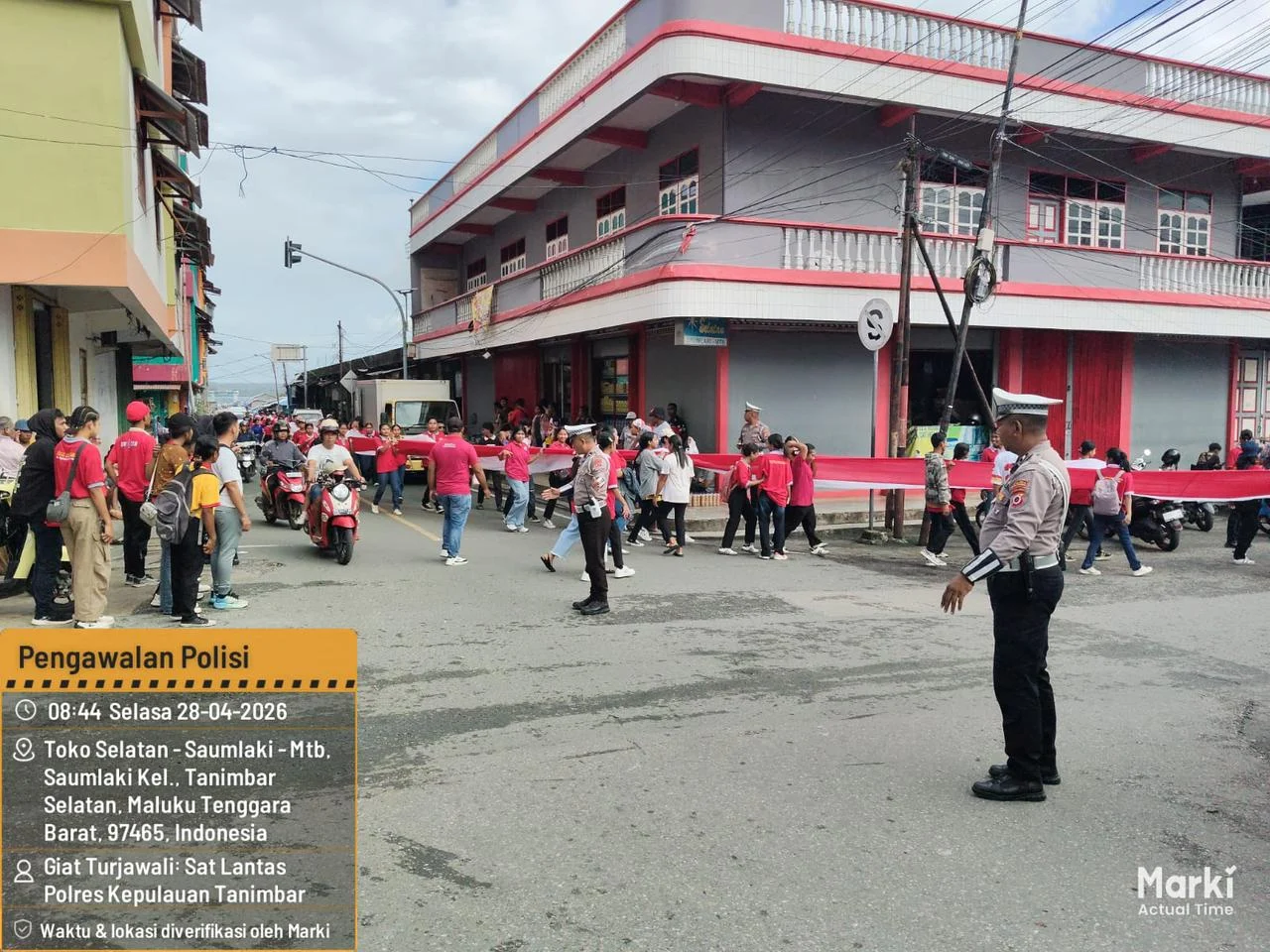http://info86news.com | Saumlaki – Satuan Lalu Lintas Polres Kepulauan Tanimbar melaksanakan pengawalan dan pengamanan rute aksi longmars mahasiswa Universitas Lelemuku Saumlaki dalam rangka menyongsong peringatan Hari Pendidikan Nasional (Hardiknas) di Kota Saumlaki, Selasa (28/04/2026).