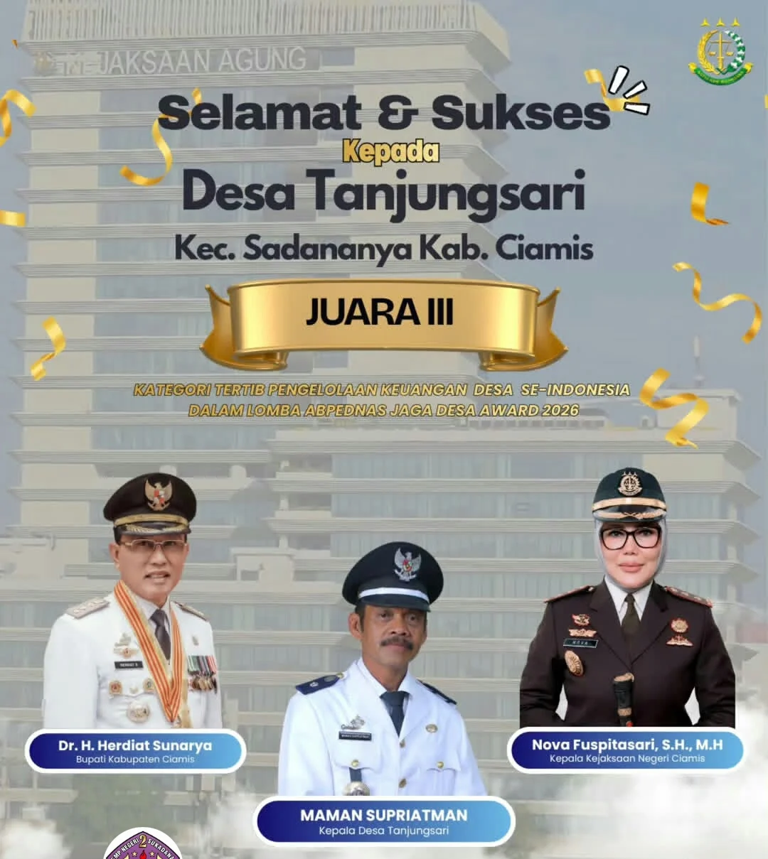 Kami sampaikan apresiasi dan ucapan terima kasih yang sebesar-besarnya kepada:Pemerintah Kabupaten Ciamis,Kejaksaan Negeri Ciamis,DPMD Kabupaten Ciamis,Kecamatan Sadananya,serta seluruh pihak dan lapisan masyarakat yang telah memberikan bimbingan,dukungan,dan doa hingga prestasi ini dapat diraih.
